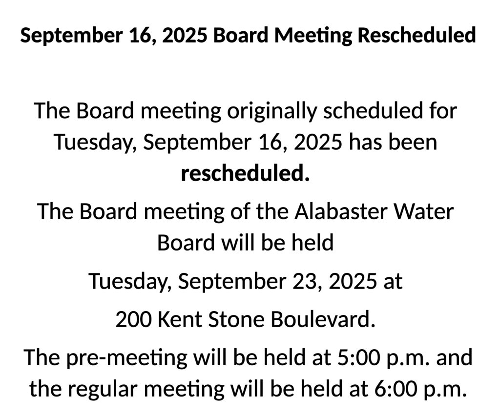 Pursuant to the Alabama Open Meetings Act, the Alabaster Water Board hereby gives notice, as required under §2(6) of said Act, of the prearranged gathering of a majority of its Board of Directors. A majority of the Directors of the Alabaster Water Board will meet for a Pre-Board Meeting at 5:00 pm followed by its regularly scheduled Monthly Meeting at 6:00 pm at the offices of Alabaster Water, located at 200 Kent Stone Blvd, Alabaster, AL on the following dates.